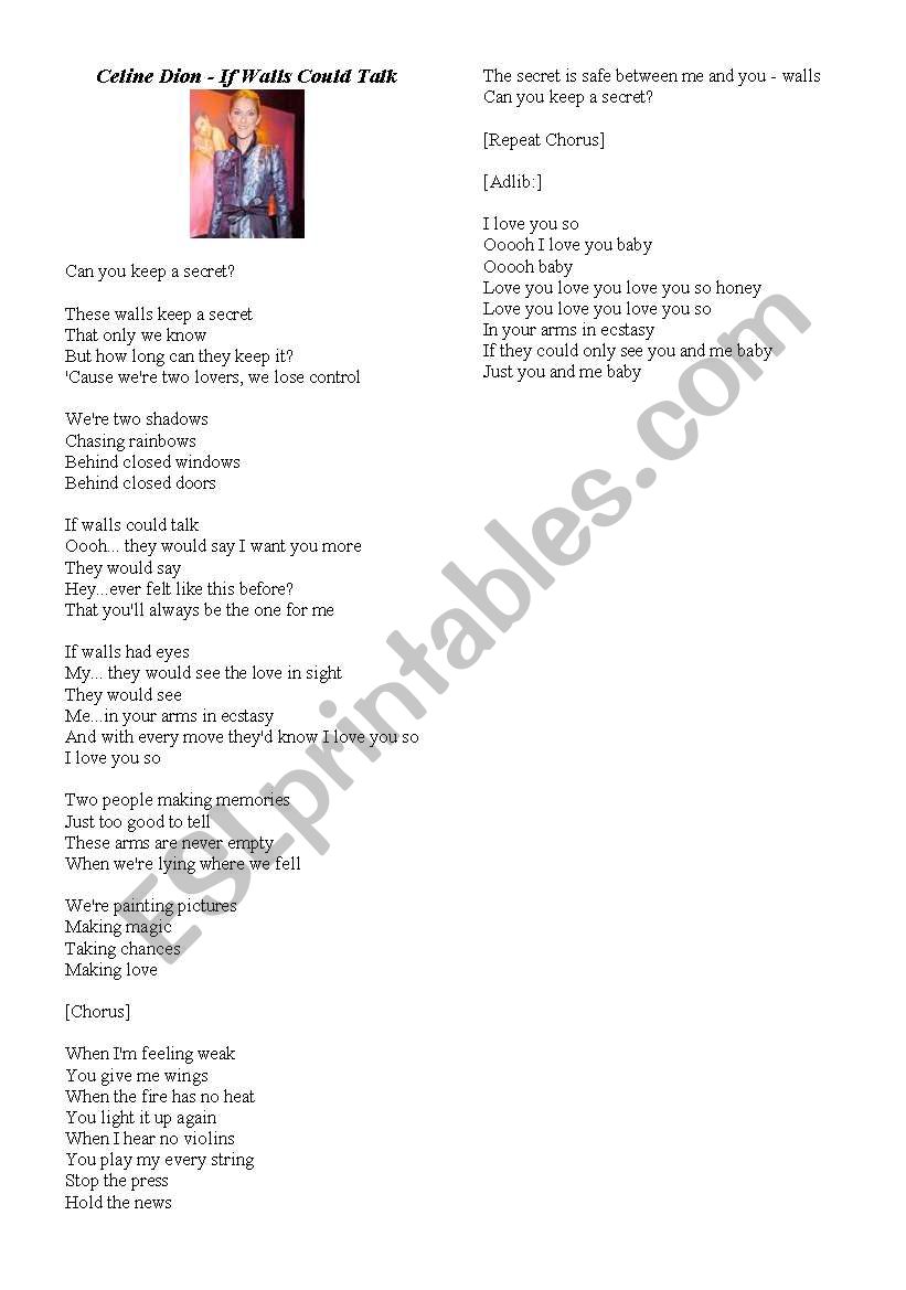 Celine dion if walls could talk video download. If walls could talk mp3 song by studio musicians from the album the hits of celine dion if walls could talk. If walls could talk is a song by celine dion which was intended as the final single from her greatest hits album all the way a decade of song. I do not own any copyright to the music or lyrics in this song i just put it together.