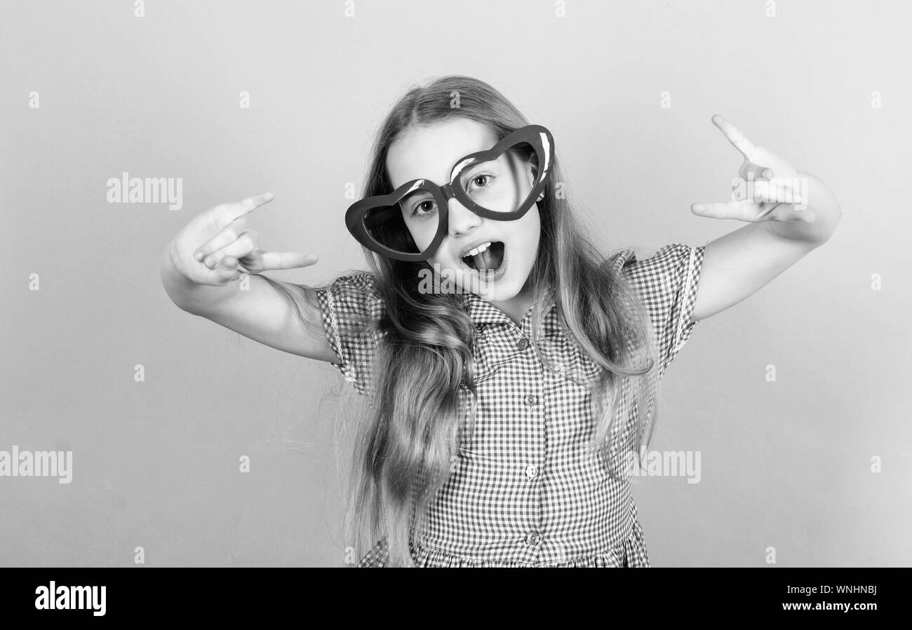 Power Of Love Kid Girl Heart Shaped Eyeglasses Girl Adorable Smiling Face Fall In Love Child Charming Smile Blue Background Kid Happy Lovely Enjoy Childhood Heart Symbol Of Love Fashion Eyewear Stock